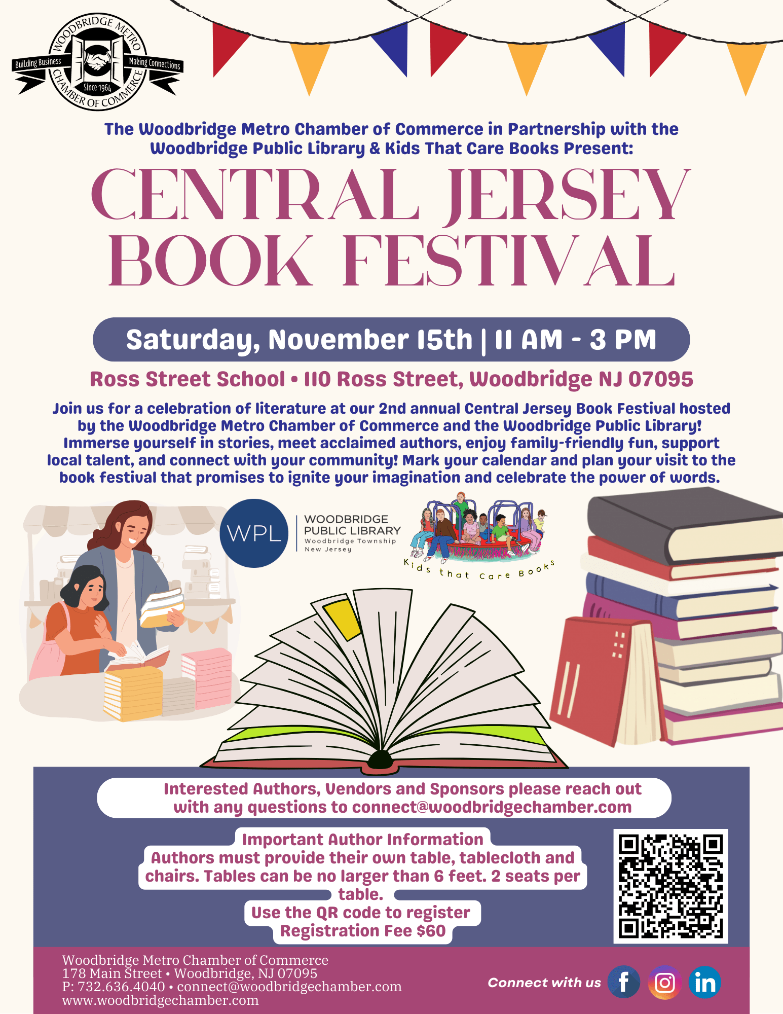 Join us for a celebration of literature at our 2nd annual Central Jersey Book Festival hosted by the Woodbridge Metro Chamber of Commerce and the Woodbridge Public Library! Immerse yourself in stories, meet acclaimed authors, enjoy family-friendly fun, support local talent, and connect with your community! Mark your calendar and plan your visit to the book festival that promises to ignite your imagination and celebrate the power of words.