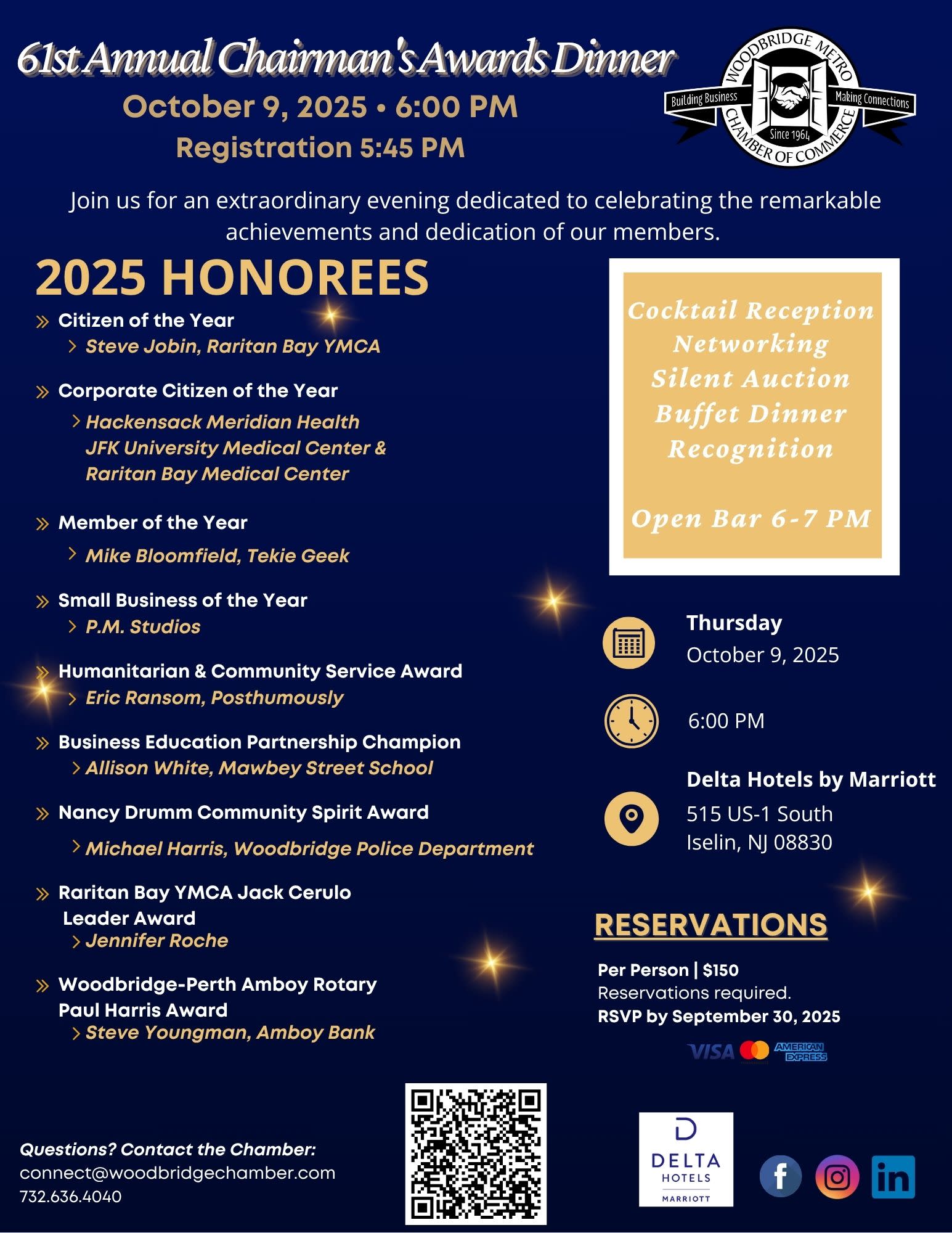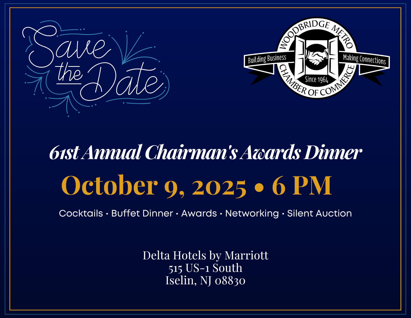 Join us for the Woodbridge Metro Chamber of Commerce's 61st Annual Chairman's Awards Dinner, our prestigious networking and fundraising event that allows us the opportunity to honor businesses and individuals for outstanding contributions to Woodbridge Township and our surrounding areas.Sponsors