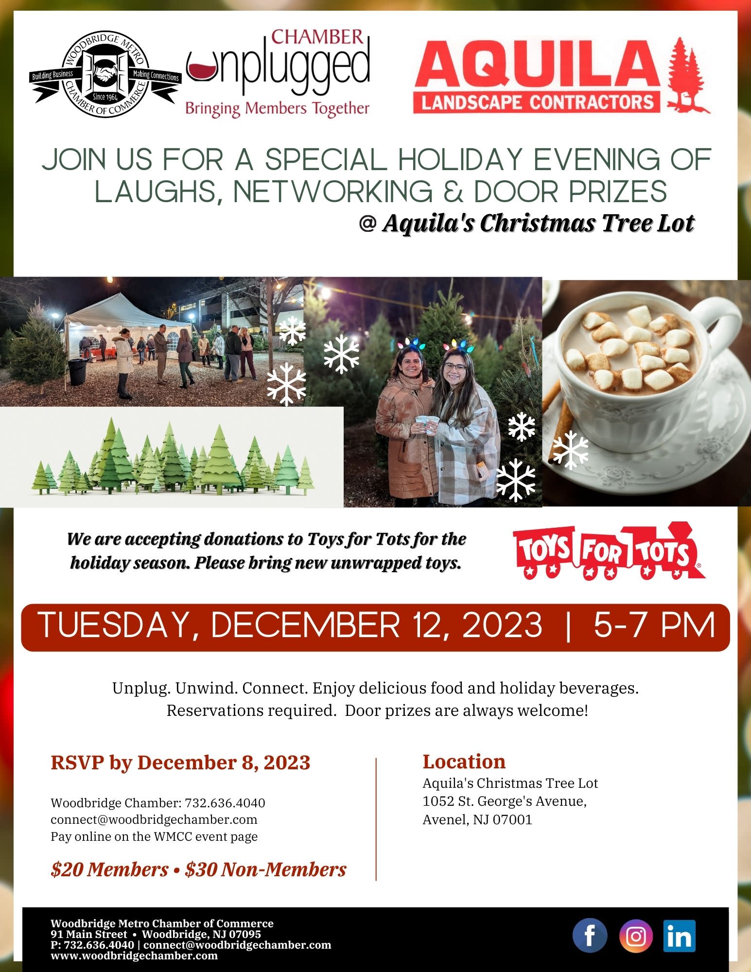 Unplug. Unwind. Connect. Enjoy delicious food and holiday beverages. Reservations required. Door prizes are always welcome! We are accepting donations to Toys for Tots for the holiday season. Please bring new unwrapped toys.Images