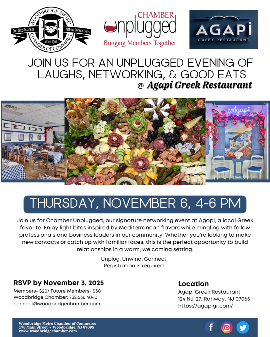 Join us for Chamber Unplugged, our signature networking event at Agapi, a local Greek favorite. Enjoy light bites inspired by Mediterranean flavors while mingling with fellow professionals and business leaders in our community. Whether you're looking to make new contacts or catch up with familiar faces, this is the perfect opportunity to build relationships in a warm, welcoming setting.Images