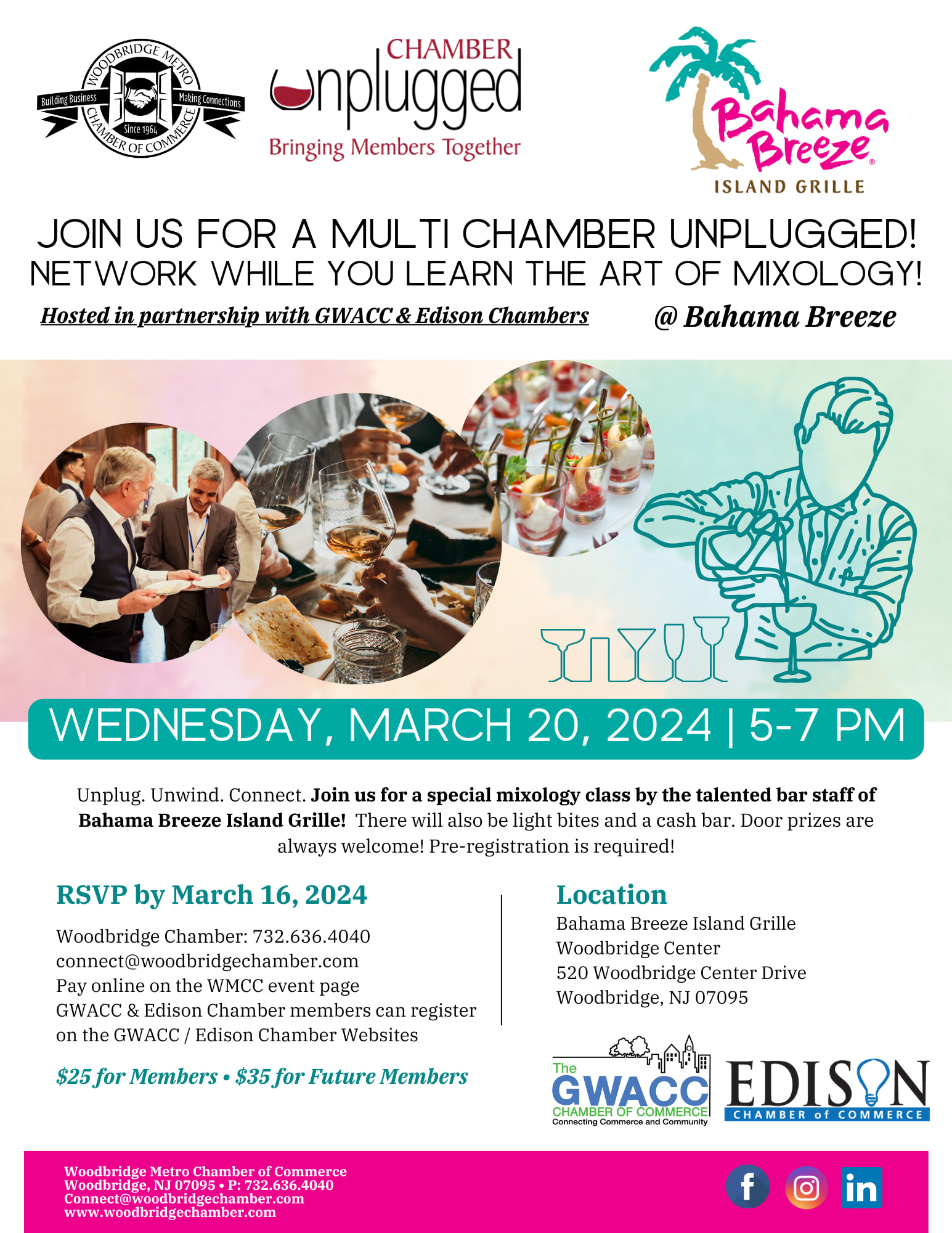 Unplug. Unwind. Connect. Join us for a special mixology class by the talented bar staff of Bahama Breeze Island Grille! There will also be light bites and a cash bar. Door prizes are always welcome! Pre-registration is required!Images