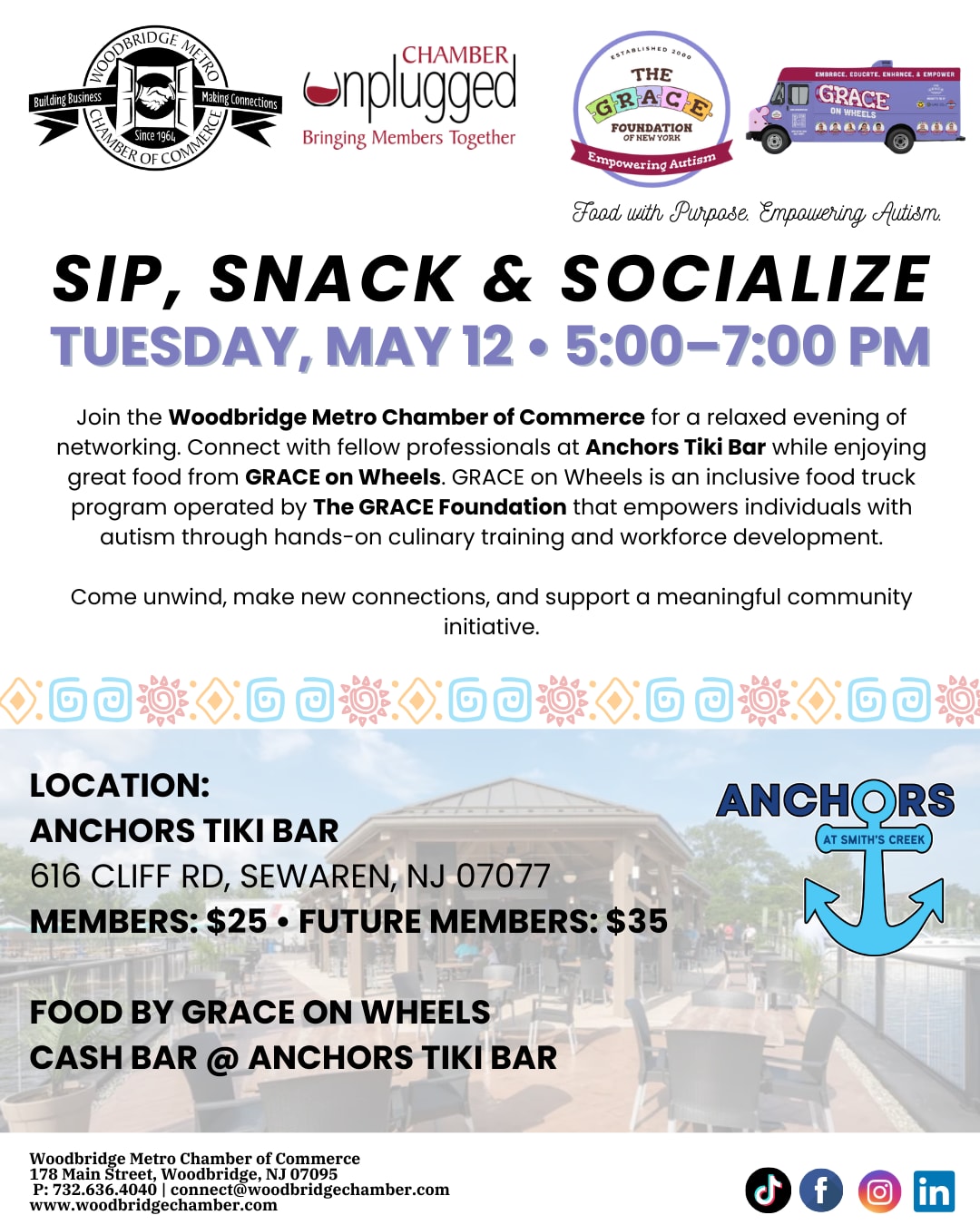 Food with Purpose. Empowering Autism. Join the Woodbridge Metro Chamber of Commerce for a relaxed evening of networking. Connect with fellow professionals at Anchors Tiki Bar while enjoying great food from GRACE on Wheels. GRACE on Wheels is an inclusive food truck program operated by The GRACE Foundation that empowers individuals with autism through hands-on culinary training and workforce development. Come unwind, make new connections, and support a meaningful community initiative.Images